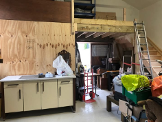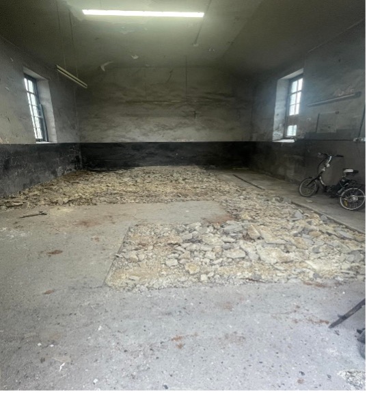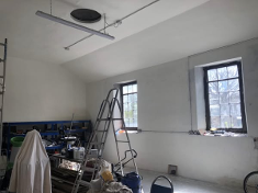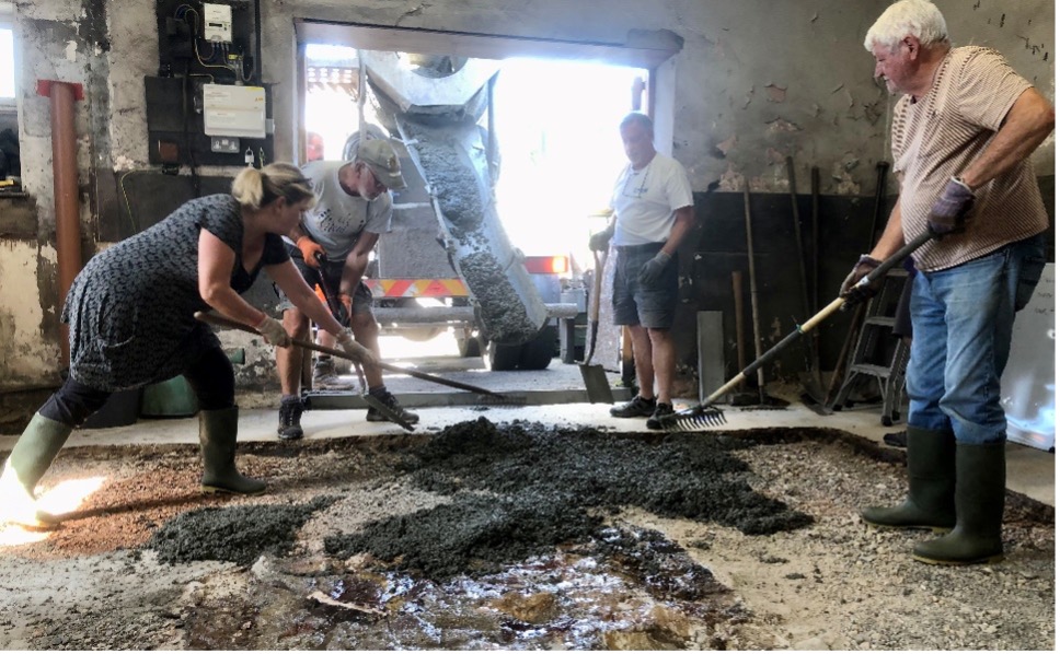 The pictures tell a thousand words! You can see how the floor was broken up, and new concrete laid. The old windows replaced, and ceiling/walls repainted with the necessary lime-based paint. A New Mezzanine added to help organise storage of tools and other items.